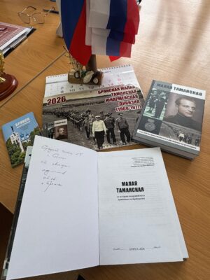 Она передала в дар школьной библиотеке два экземпляра новой книги, авторами которой являются Александр Городков, профессор Брянского государственного технологического университета, и Владимир Зарубин (проживает в данное время в Тульской области). Книга посвящена истории легендарной Таманской дивизии.