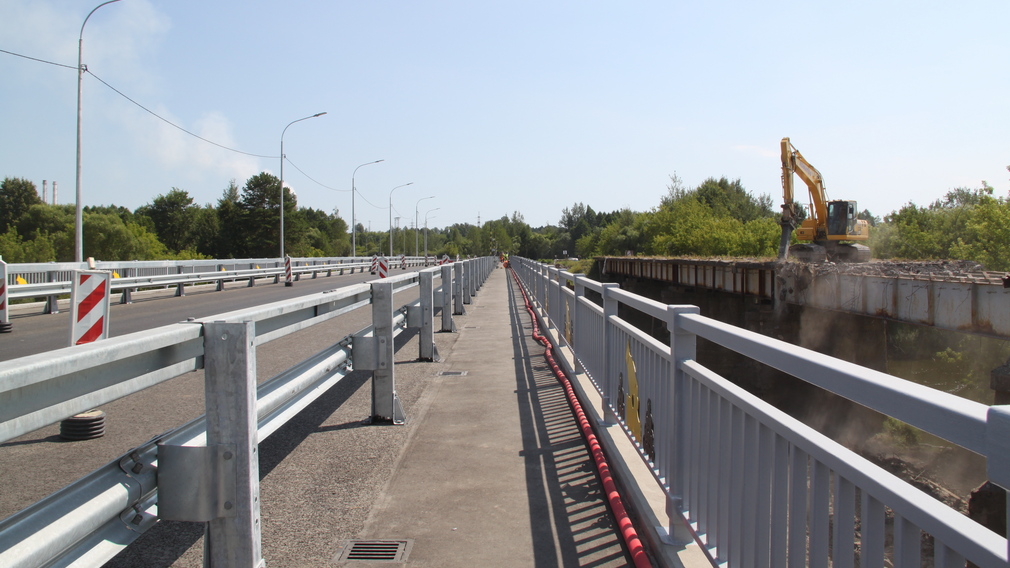 Подрядчик уже завершает работы на новом мосту. Здесь организовано реверсивное движение со светофорным регулированием. На мосту установлено новое электроосвещение, барьерное ограждение.