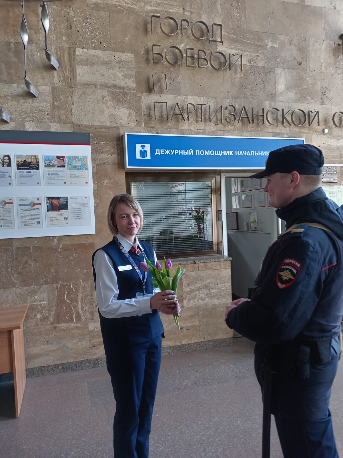 Праздничное настроение транспортной полиции постарались подарить также сотрудницам и пассажирам на железнодорожном вокзале станции Брянск-Орловский, они поздравили женщин с международным женским днем и пожелали веселья и радости, огромного счастья, тепла и комфорта в пути следования на железнодорожном транспорте и преподнесли букеты весенних цветов.